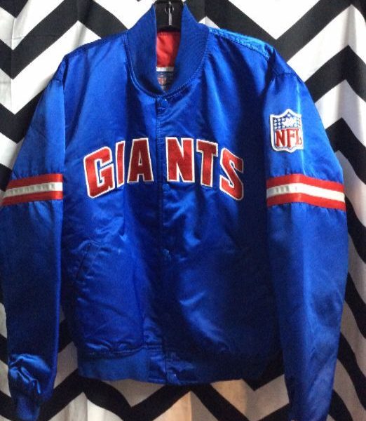 Baseball style jacket, satin, NY Giants, button-up, NFL patch, striped sleeves, blue/red/white, size L
