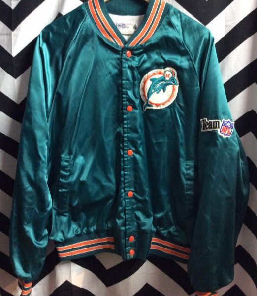 Baseball style jacket, satin, Miami Dolphins, button-up, Team/NFL patches, turq/orange/white as is
