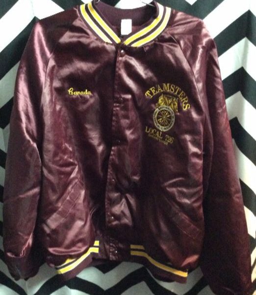 Teamsters satin baseball style jacket, button-up, embroidered designs chest and full back, burgundy/yellow, size XXL