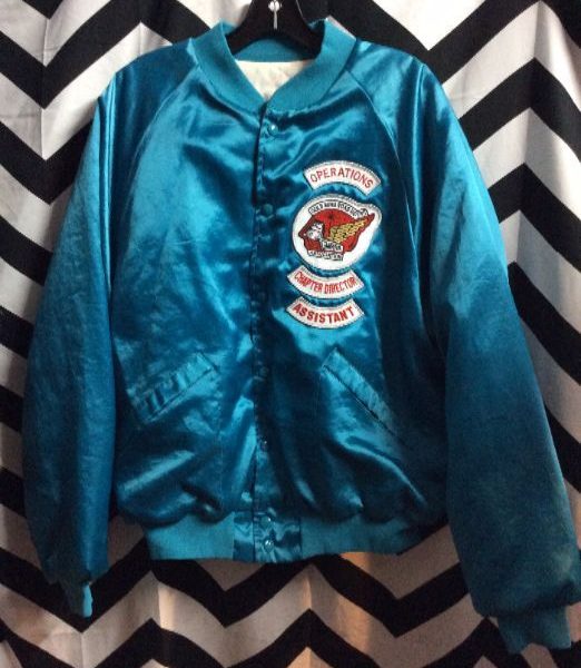 Baseball style jacket, satin, button-up, Gold Wing Road Riders – Operation Chapter Director patches, embroidered motorcycle, turq/red/white