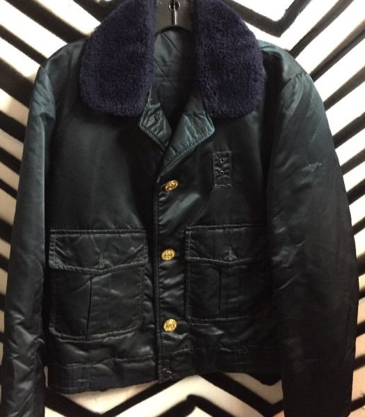 Police jacket, navy blue satin zip-up with gold buttons, faux fur collar, size M