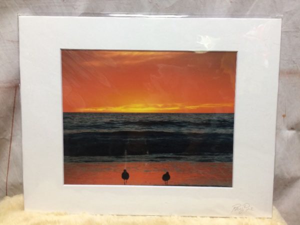 Mounted photograph, Ray Rae local photographer, seagulls & sunset beach scene, size 10″ x 13″
