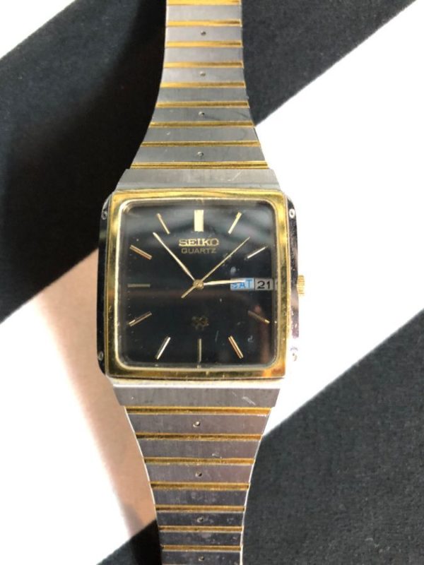 1980’s Seiko watch, square gold metal face & hands, gold & silver metal band, silver/gold/black
