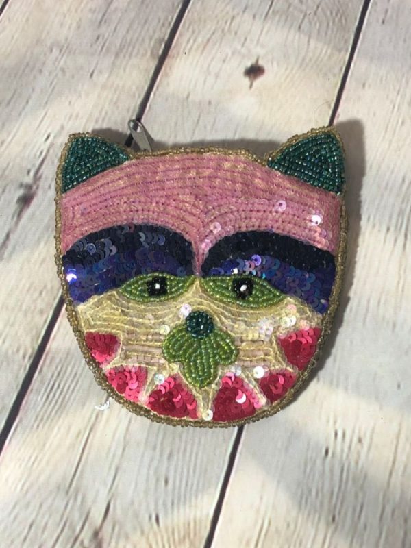 Coin purse, zippered closure, cat face design, sequin embellished, purple/pink/red/creme/green