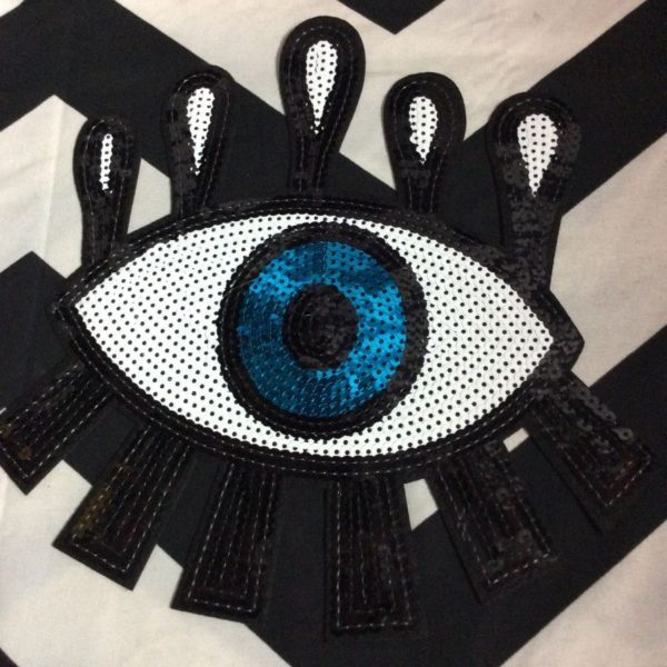 Patch, sequin embellished, eyeball that is dripping, white/black/blue, size 9″ x 9″