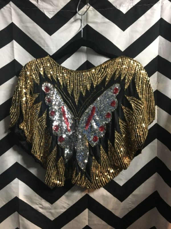 Shirt, silk, cropped, short sleeves, sequin embellished with large butterfly design, black/gold/red/silver, size S as is