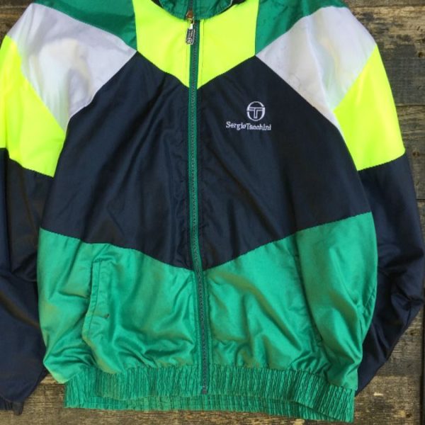 Sergio Tacchini windbreaker jacket, zip-up, day-glow colors, color-block design, green/white/day-glow yellow, size L as is