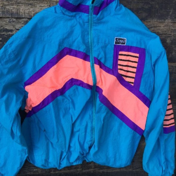 Sergio Valente windbreaker jacket, zip-up, day-glow colors, color-block design, left chest logo patch, teal/pink/purple, size L