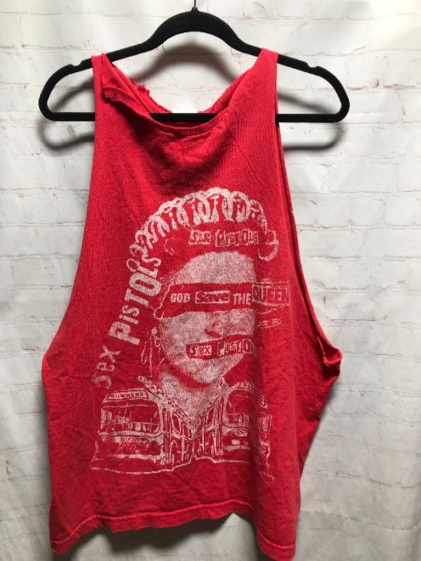 WCW tank top, cotton, Sex Pistols, God Save The Queen, screen printed front & back graphic & lettering, distressed, red/white, size one size As is