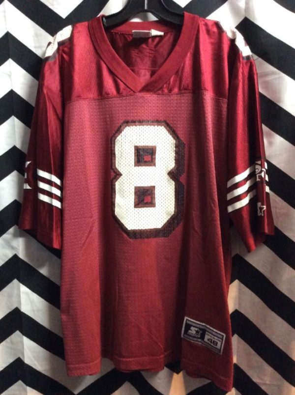 Starter football jersey, San Francisco 49er’s, Young #8, striped sleeves, screen printed lettering & number, NFL, maroon/white/black, size L