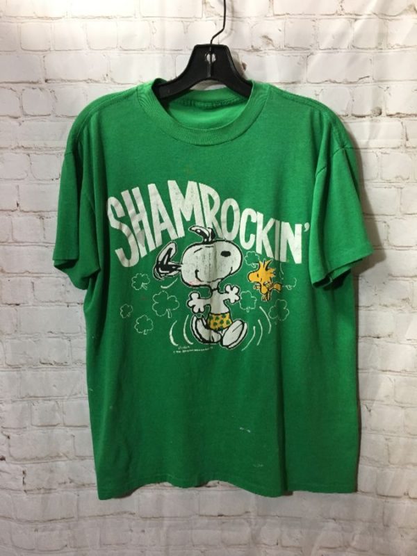 T-shirt, screen printed Shamrockin’ lettering with Snoopy & Woodstock design full front design, green/white/yellow, size M. As is