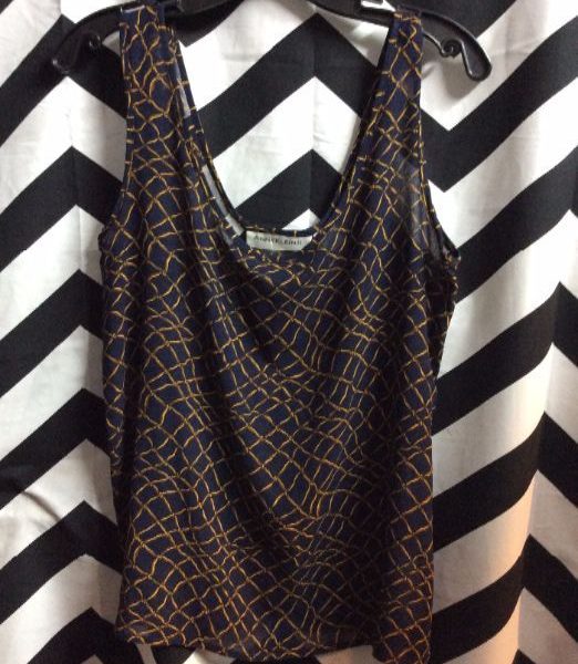 Tank top, sheer, chain print design, navy/gold