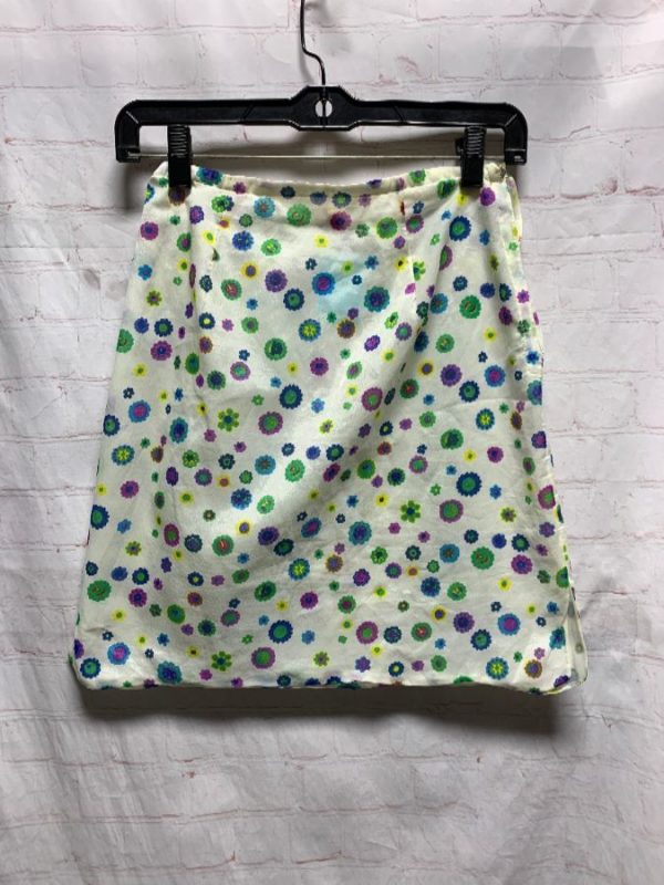 Saks Fifth Avenue skirt, sheer, mod style, mini length, side snap closure, flower print, white/green/yellow/light blue/blue/purple, size S As is