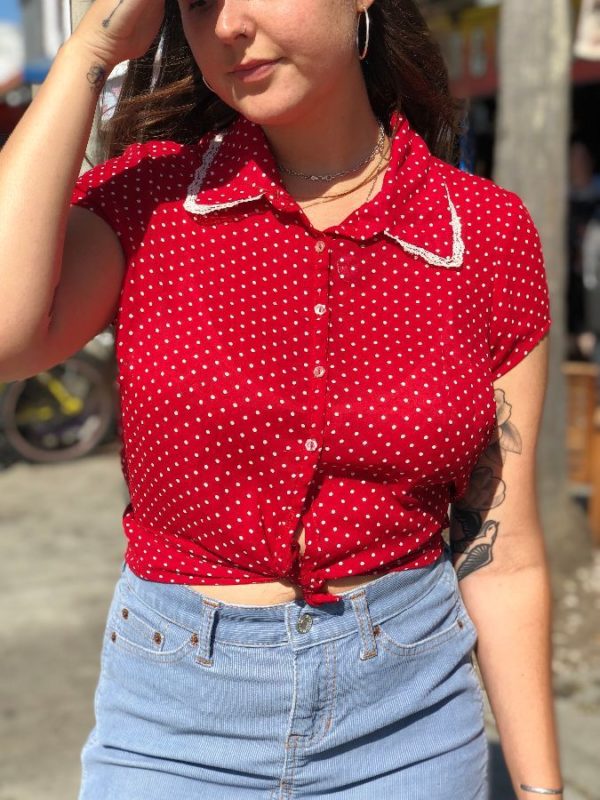 POLKA DOT BLOUSE W/ LACE COLLAR & FLOWER BUTTONS