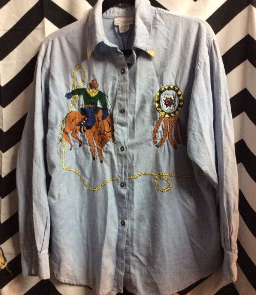 WESTERN DENIM SHIRT W/EMBROIDERED COWBOY BUCKING HORSE & DREAM CATCHER