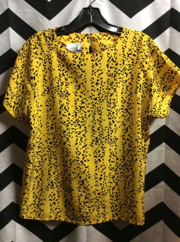 1980’s blouse, short sleeves, single button in back, vertical lines with splatter pattern, yellow/black, size M