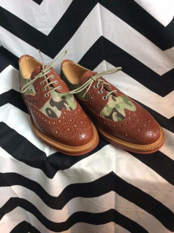 OXFORD SHOES, ARMY PRINT AND LEATHER DESIGN, MEDIUM BROWN/GREEN/CHOCOLATE BROWN
