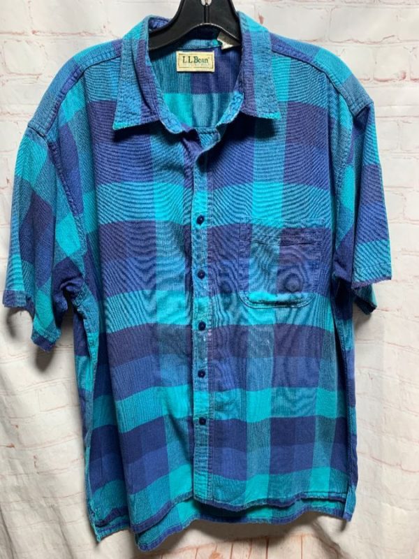 L.L. Bean shirt, cotton, short sleeves, button-up, large plaid print, soft, front left pocket, light blue/dark blue, size L
