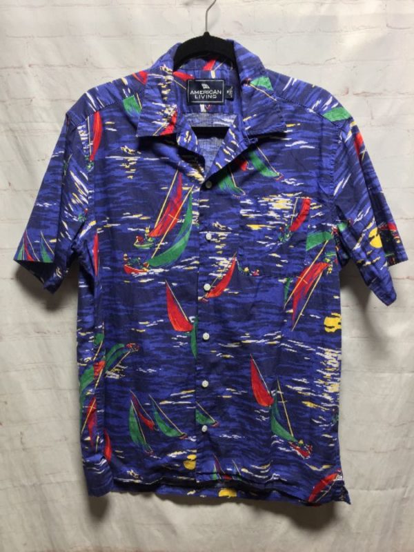 COTTON HAWAIIAN STYLE SHIRT W/ SAILBOAT PRINT