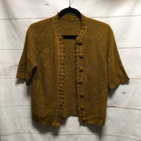 Retro cardigan sweater, knitted, short sleeves, button-up with yarn covered buttons, ribbed cuffs & hem, crochet decorative trim around edge of neck & down front, dark mustard, size M