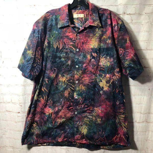 The Territory Ahead shirt, short sleeves, button-up, collar, watercolor leaf design print, front chest pocket, black blue green red multi, size L