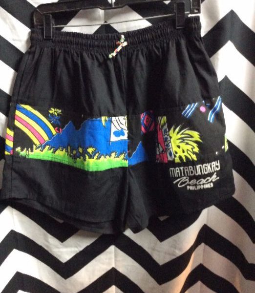Shorts, Matabungkay beach, Philippines, neon colored design horizontal stripe, black/neon multi-colored