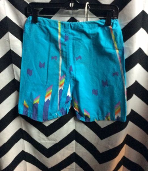 AMAZING DEADSTOCK 1980S DAYGLO NEON BEACH PRINT SHORTS WITH STRETCH WAIST