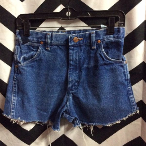 WRANGLER DENIM SHORTS, CUTOFF, ZIP-FLY, RED TAB, DARK BLUE, SIZE 16