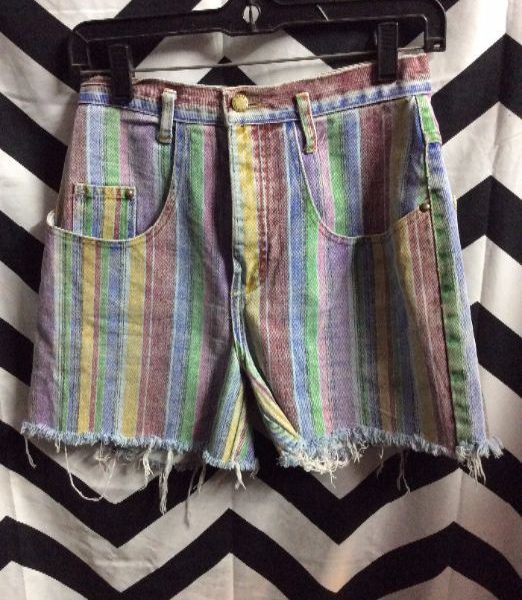 DENIM SHORTS – CUTOFF – MULTICOLOR VERTICAL STRIPES – WORN & FRAYED