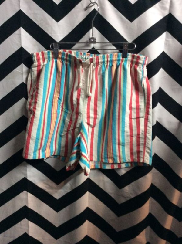 1980’s Fast Lane of California shorts, lounge style, elastic waist with drawstring, vertical stripe design, multi-color, gray/yellow/purple/aqua/multi, size M