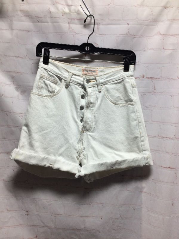 Guess Jeans denim shorts, button-up fly, high waist, rolled cuffs, Guess logo on right back pocket, distressed and holes throughout, rad, white, size 27W