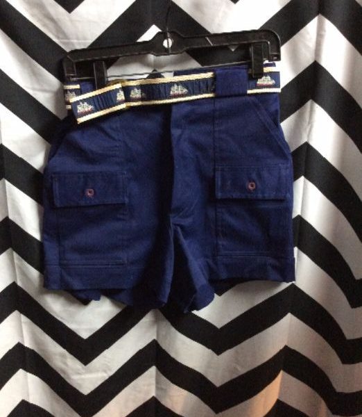 Shorts, stretch fabric, button-up pockets, sailboat design belt, navy blue, size 14