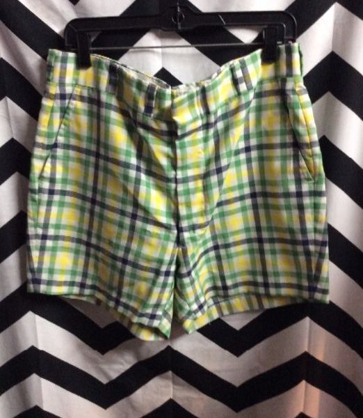 Shorts, linen, plaid design, white/yellow/green, size 34W