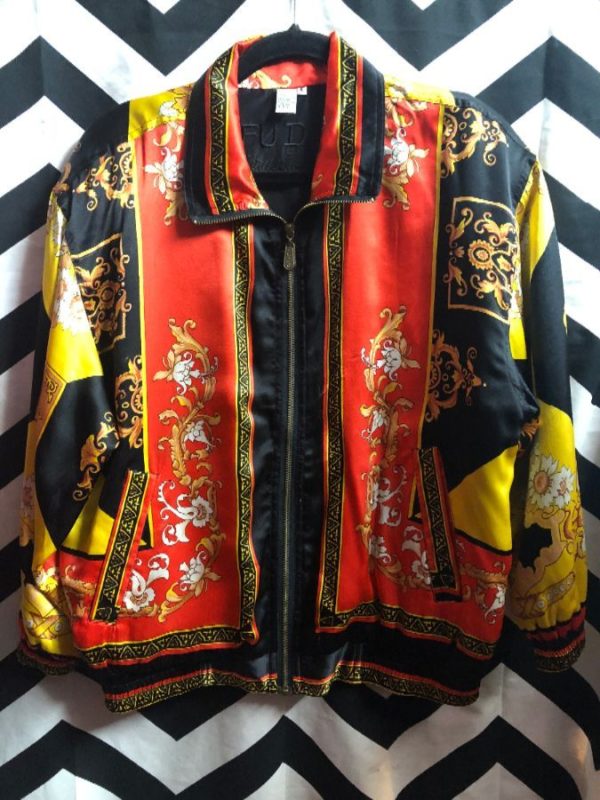 Bomber jacket, silk, zip-up, Baroque print, black/red/gold, size S