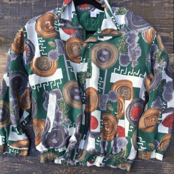 Windbreaker jacket, silk, zip-up, Greek pattern design, green/white/tan, size M