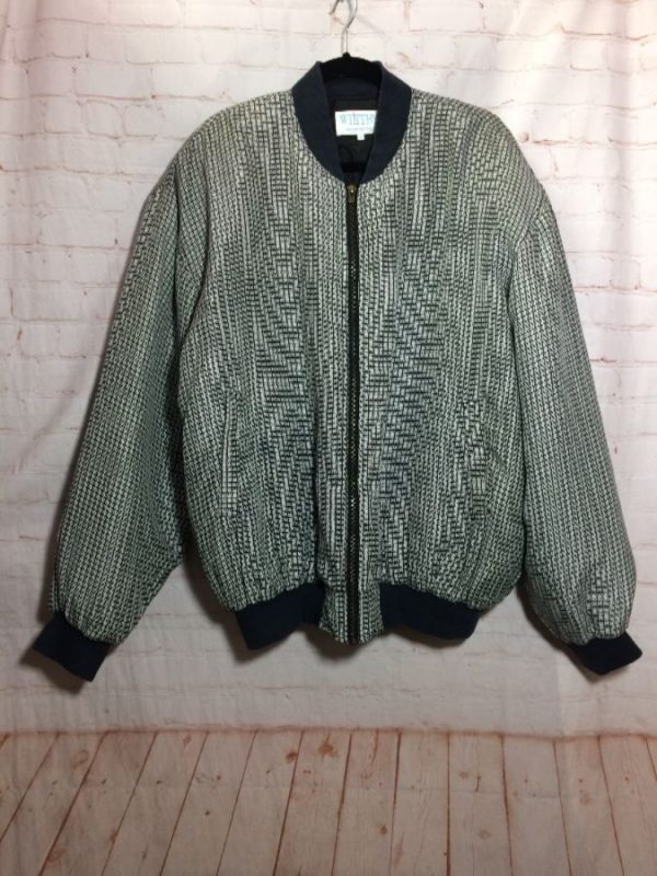 Bomber jacket, silk, zip-up, contrasting trim on collar/cuffs/hem, square grid design, black/white As is