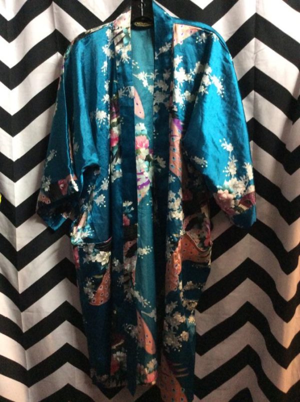 Kimono, silk, bird & cherry blossom pattern design, teal/multi, size one size fits all as is belt missing