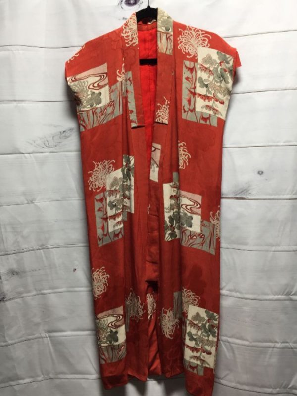 KIMONO, SILK, SLEEVELESS, BLOCKS OF PRINTED FLORAL DESIGNS, ORANGE/CREME/BROWNISH GRAY, SIZE ONE SIZE FITS ALL AS IS