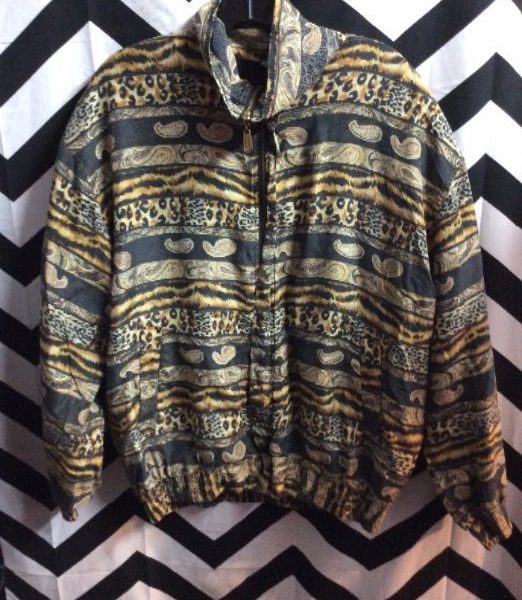 Windbreaker jacket, silk, zip-up, Paisley & leopard stripe design, tan/brown/black, size L