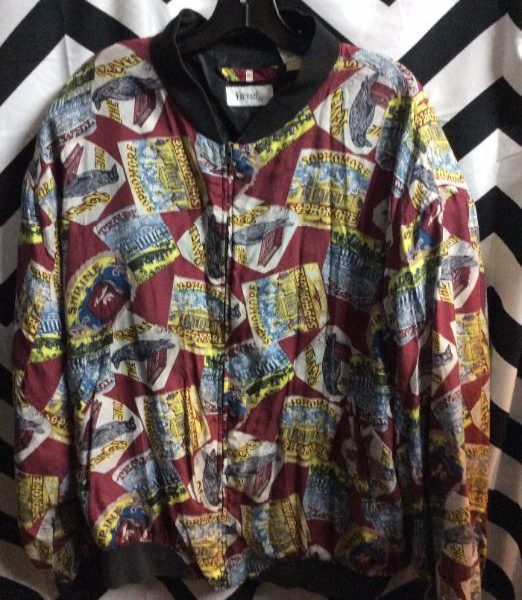 Bomber jacket, zip-up, silk, ephemera, raven & sophomore printed design, brown/creme, size XL