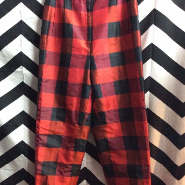 Pants, silk, high waist, plaid design fabric, red/black, size 28W