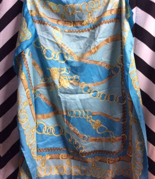 Scarf, silk, belt and chain print fabric, turq/gold, size 34″ x 34″