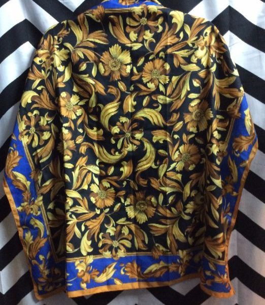 Scarf, silk, ornate gilded flower/leaf design, gold/blue/yellow, size 30″ x 30″