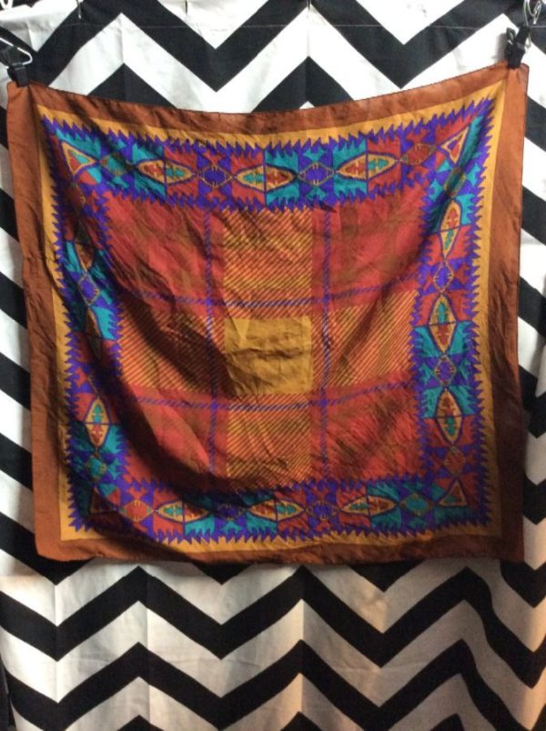 Scarf, silk, square, plaid design, Aztec style border, brown/mustard/purple/teal/copper
