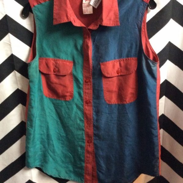 No boundaries blouse, silk sleeveless button-up, color block design, contrasting colored collar/back/front pockets & front placket, red/blue/teal