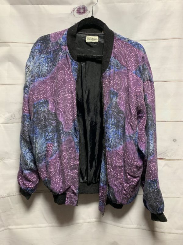 SARA ROBERTS WINDBREAKER/BOMBER JACKET, SILK, ZIP-UP, NYLON LINING, CHRISTMAS ORNAMENT LOOK DESIGNS ON TRIBAL STARRY NIGHT PATTERN, BLUE/PURPLE/BLACK/PINK, SIZE L