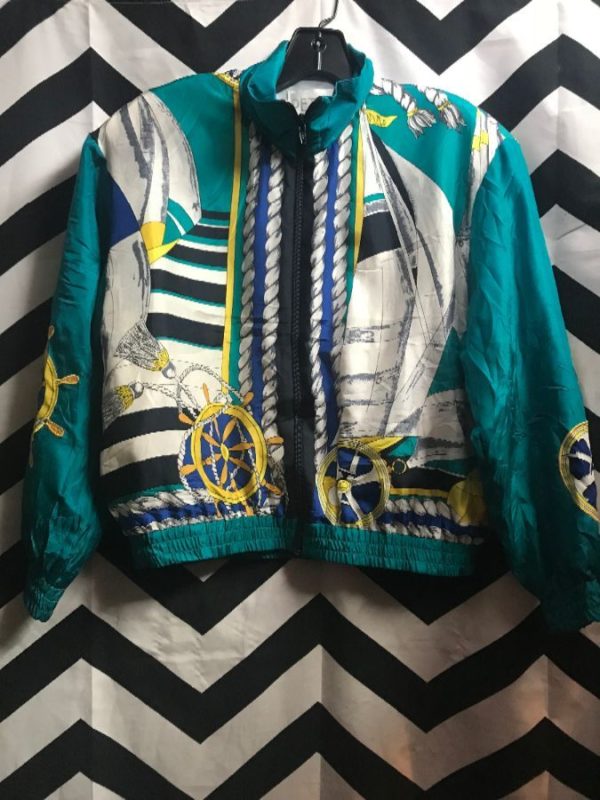 Petite Sophisticate windbreaker jacket, silk, zip-up, nautical & sail boat print, blue/green/white/black/yellow, size P/S small fit
