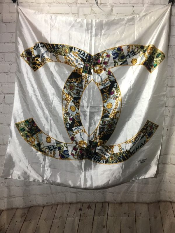Chanel Paris scarf, silky, CC logo with inner chain print design, white/gold/multi