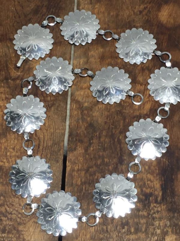 Belt, flower shaped conchos linked into a chain, embossed design, silver metal, size one size