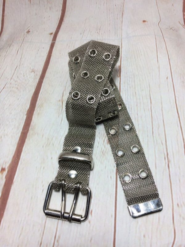 SILVER METAL MESH BELT W/ DOUBLE EYELET DESIGN & RECTANGLE ROLLER BUCKLE